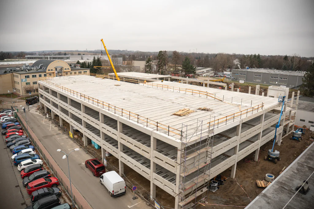 Nové parkoviště u nemocnice roste. Nabídne stovky parkovacích míst i heliport